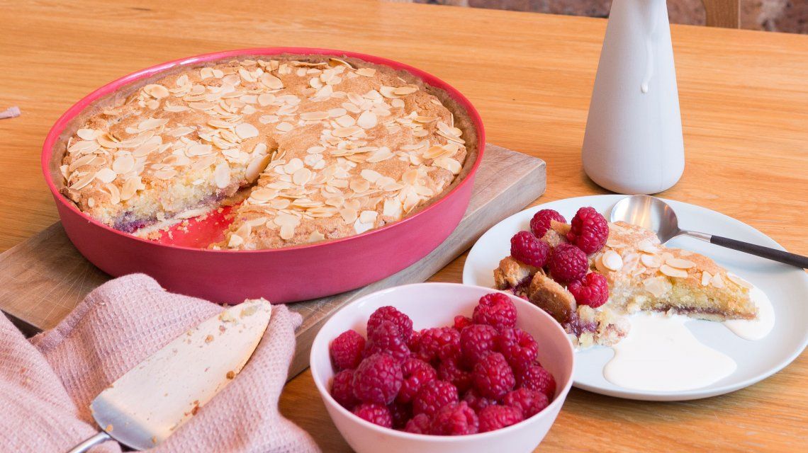 4. Remove the tart from the fridge. Spread the jam over the base, and then lay the crushed raspberries on top. Make sure they are spread out. Spoon the frangipane mixture on top and spread over. Do not overfill!