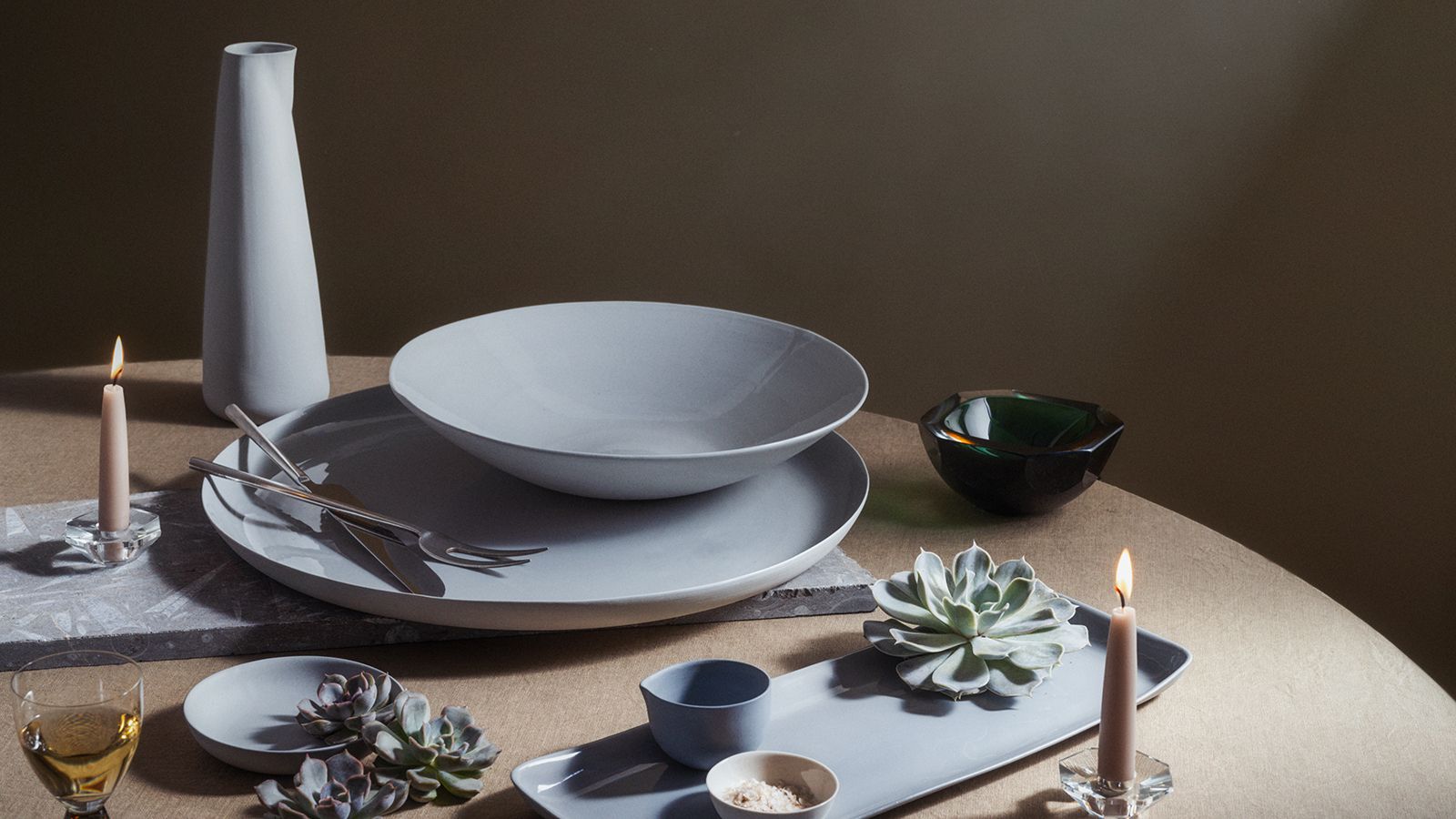 For the family dinner, the table is set in a modern palette of cool grey and sand tones with succulents from the garden. The following day there’s always a Potluck dinner with a larger group of friends who couldn’t make it home to their respective families. This is where new traditions begin as guests introduce dishes to the family – some so popular that the family forget they weren’t their recipes in the first place.