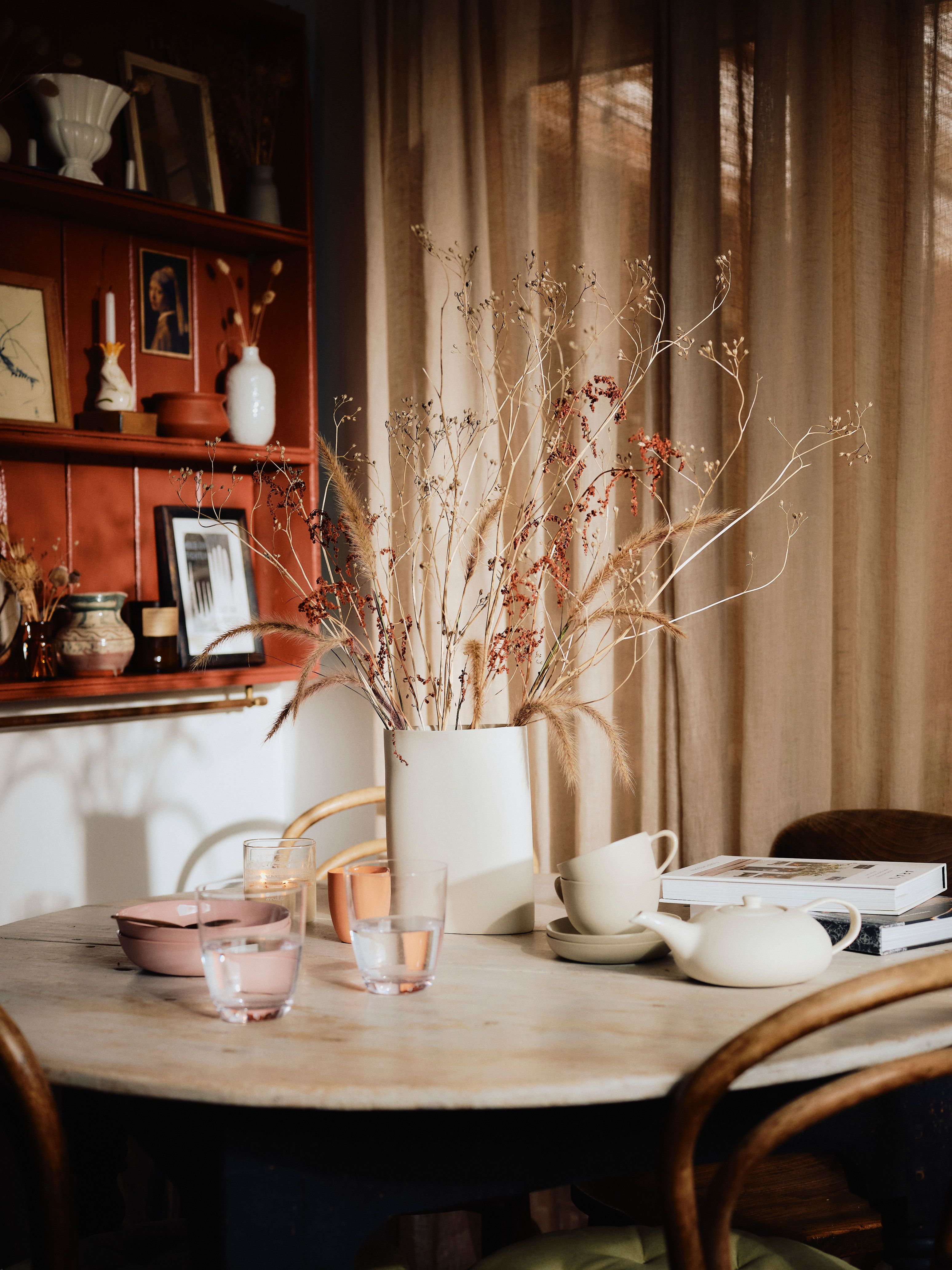J: I love the kitchen table, where we plan and enjoy our meals. I sometimes work here, and the calming garden view is the perfect backdrop. I love autumn too, but late summer is magical — with the doors open, the meadow swaying beyond, and crickets chirping. It’s such a special time of year in this house.