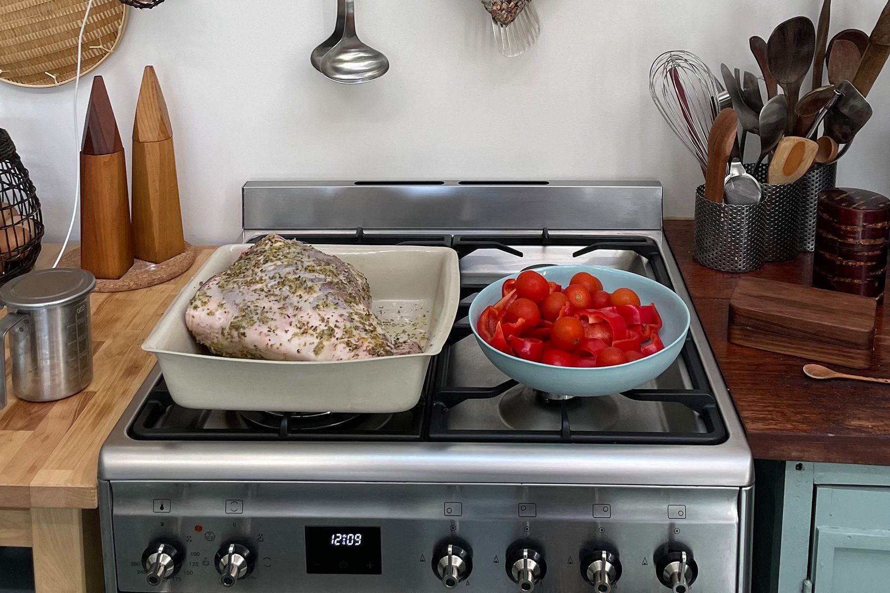 Peel and chop the potatoes and place in a large baking dish. De-seed the capsicum, cut into strips and place in the dish also along with cherry tomatoes. Sit the lamb on top of the vegetables, add the water to the dish, then cover with aluminum foil until it is well sealed (you want it to retain as much moisture as you can).