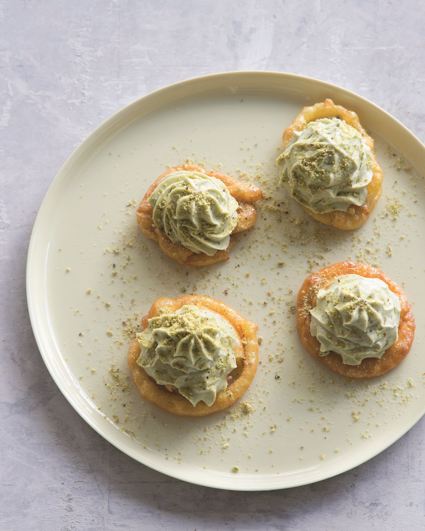To serve, place the jalebi on a plate and pipe the pistachio cream on top, forming a raised peak in the centre. Dust liberally with pistachio crumbs to lightly cover the surface of the cream. Serve immediately.