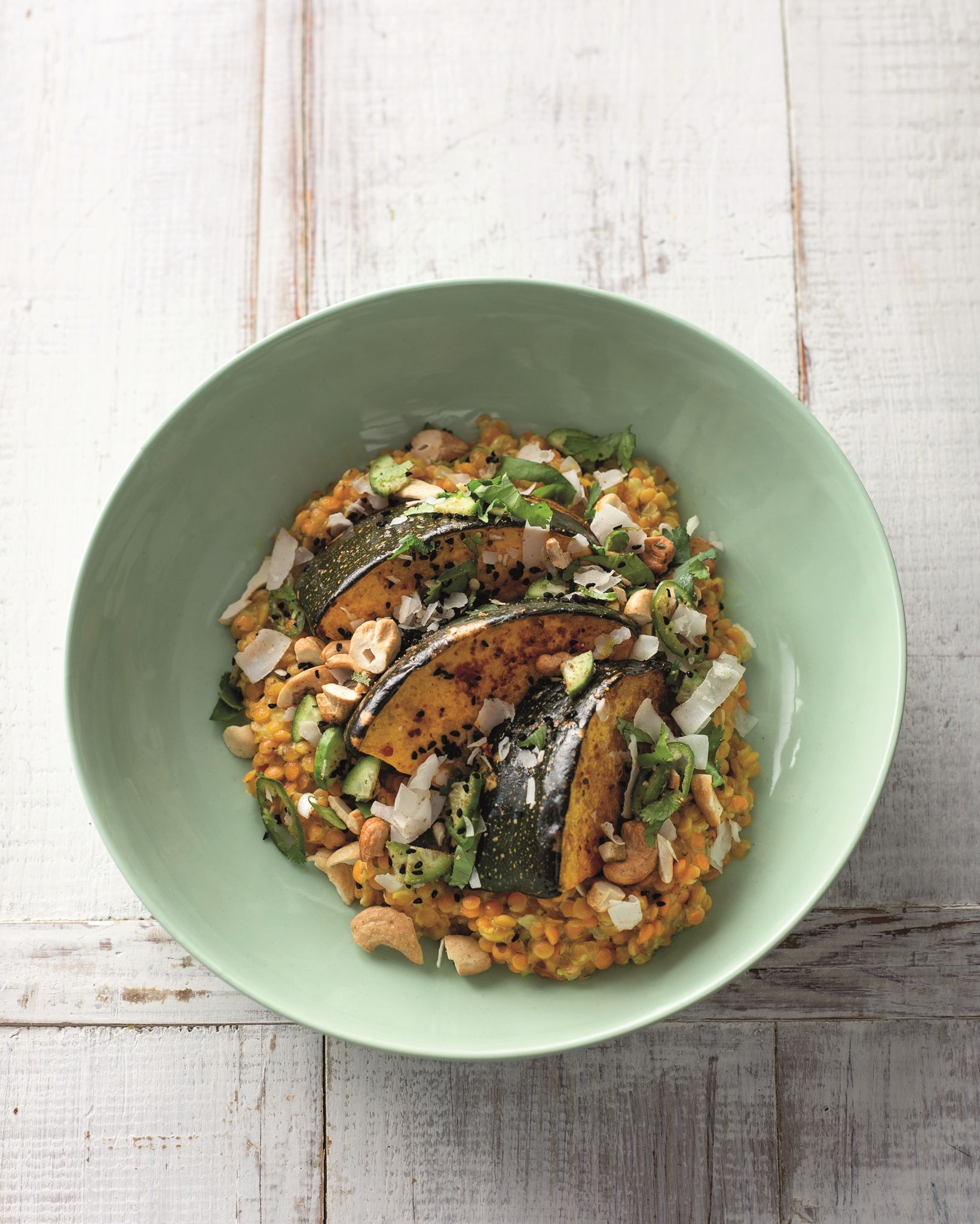 Spoon the dal into serving bowls and top with a wedge of pumpkin. Place the baby cucumber, beans, green chilli, coconut flakes, cashew, coriander leaves, lime juice and nigella seeds in a bowl, season with chaat masala and toss to combine. Scatter salad over the pumpkin and dal to serve.