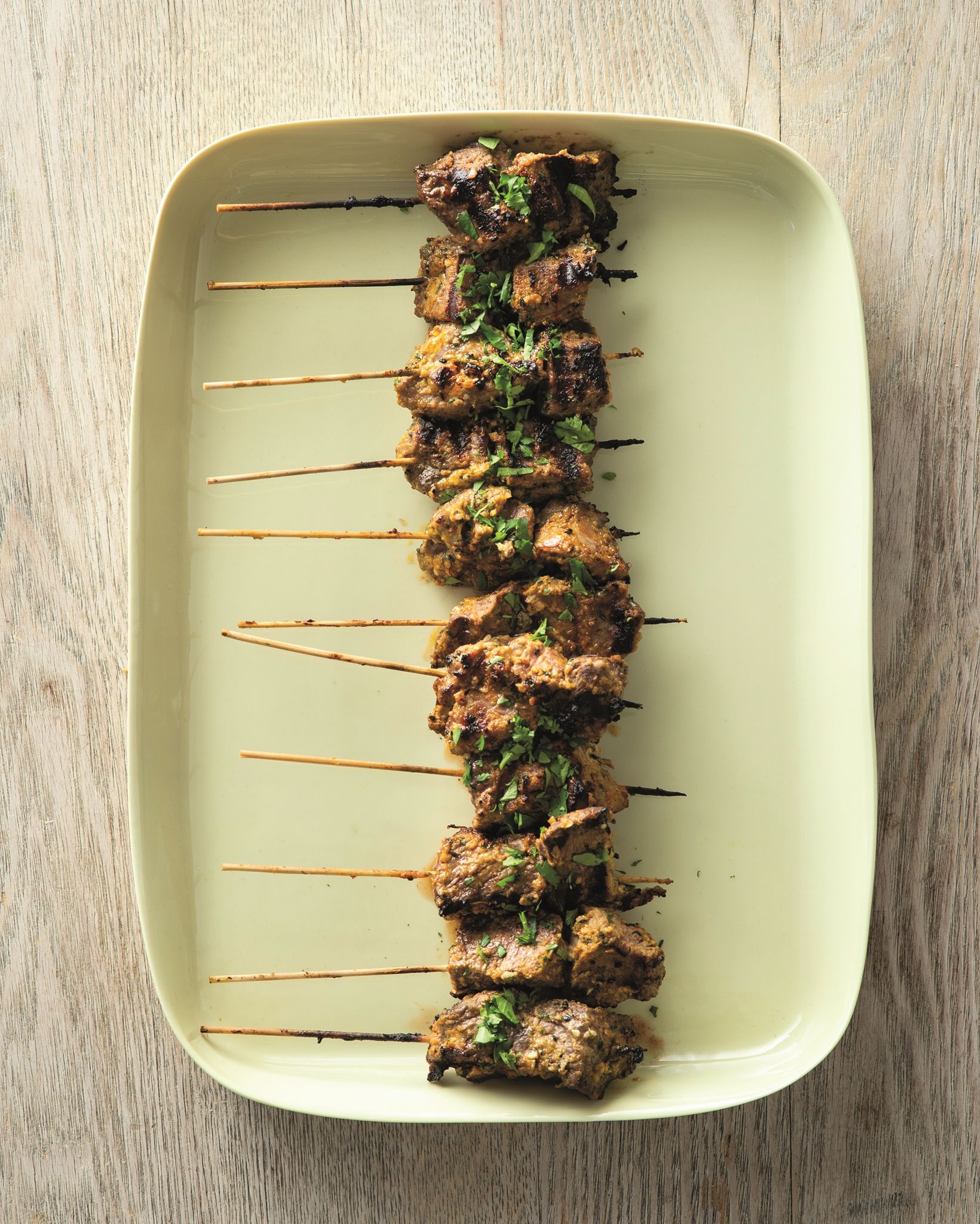 Brush a cast-iron grill plate with vegetable oil and place over the coals, making sure it is elevated above the coals to allow enough air flow and oxygen between the coals and the grill. Arrange the skewers side-by-side on the grill plate and cook for 4–5 minutes or until browned. Carefully turn the skewers and cook on the other side for a further 3–4 minutes or until meat is tender but still rosy in the centre.