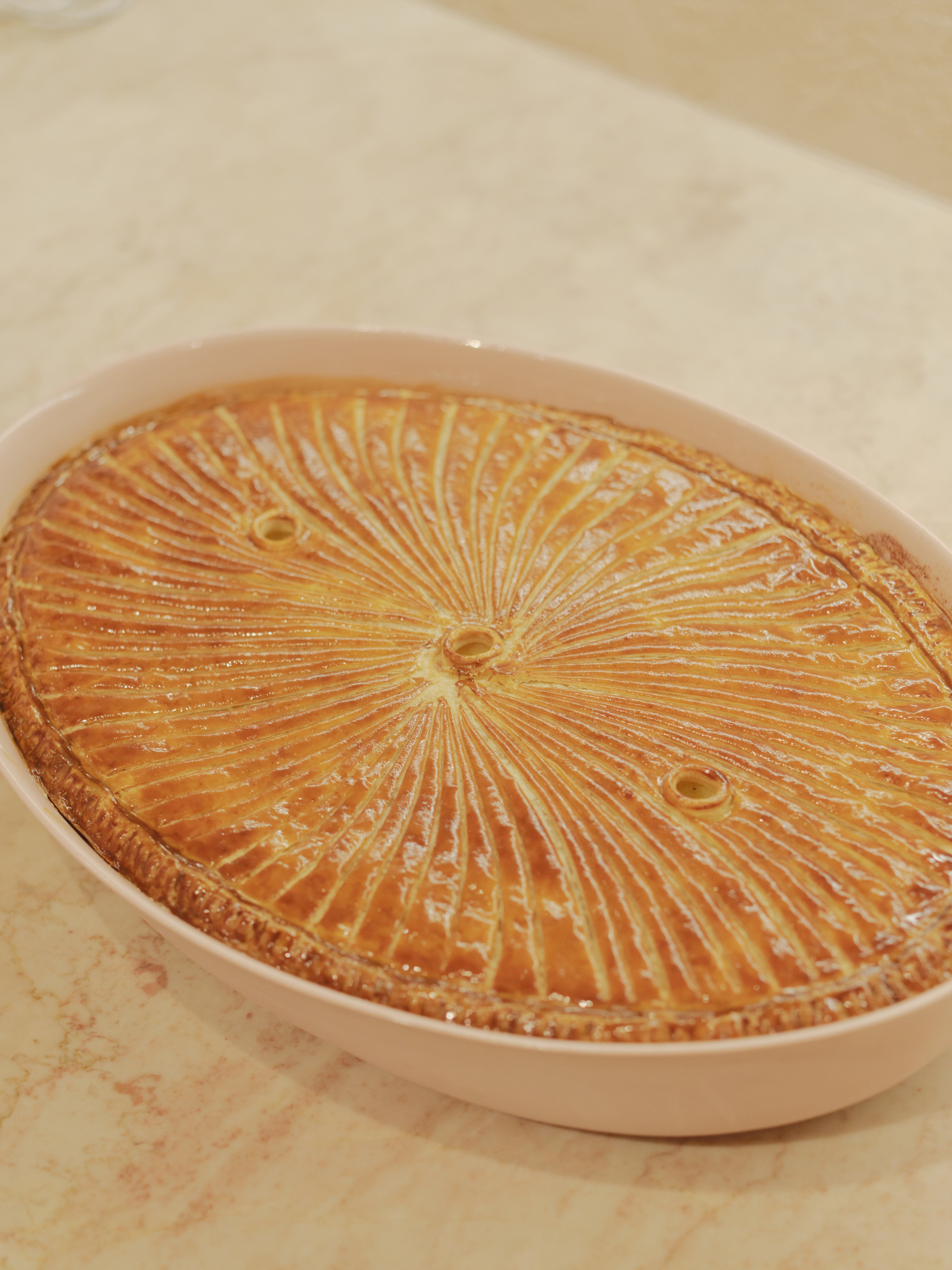 Finally, cover the cooled pie with puff pastry, trimming the edges neatly. Cut three small steam holes in the centre, gently press down to remove air pockets, and score the pastry lightly. Brush with egg yolk and bake for 40–50 minutes, or until the pastry is golden and crisp.