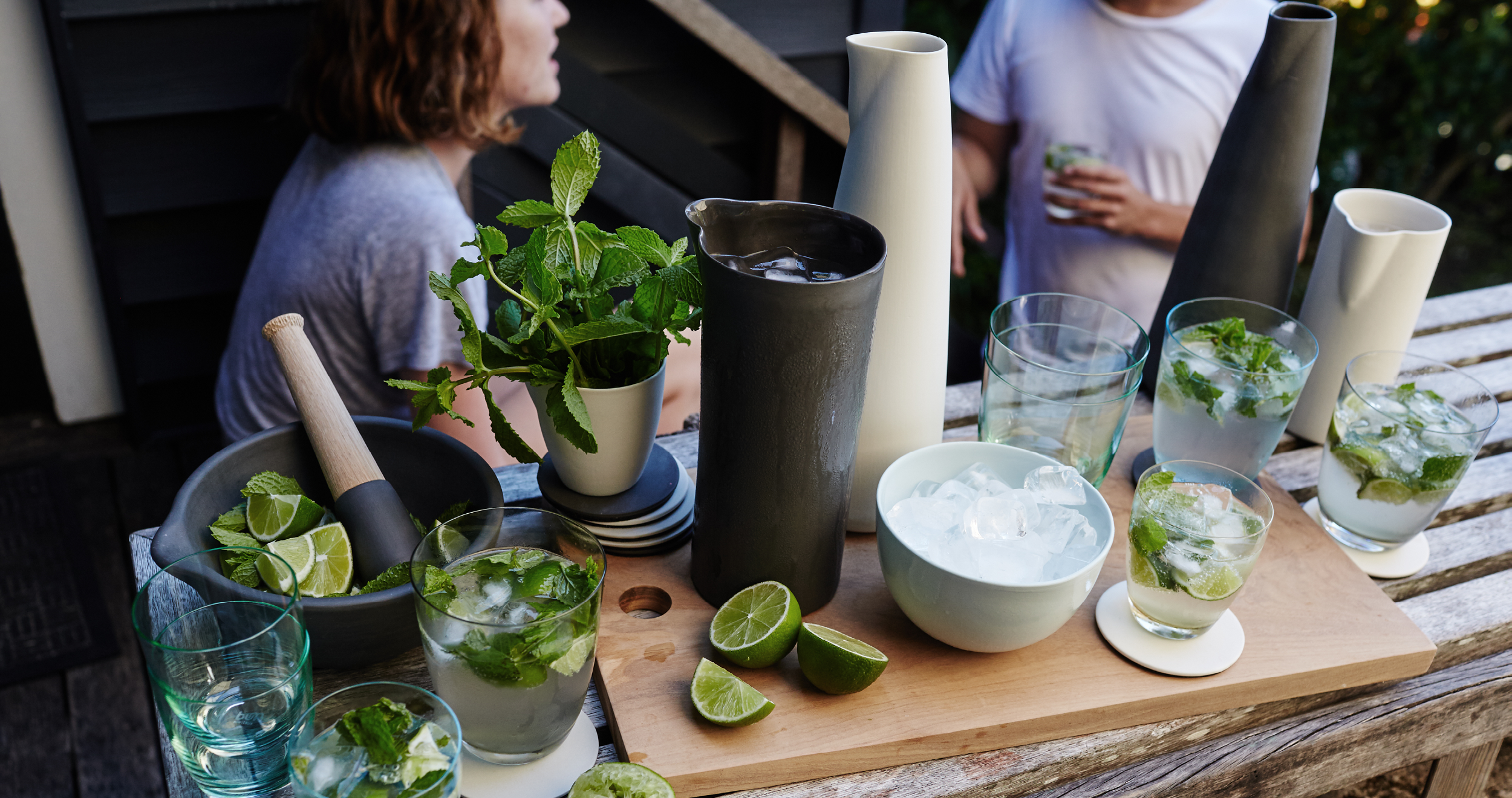 Crush the lime quarters, sugar and mint leaves in a Mortar & Pestle to release the juices, then transfer to a tall Mud Carafe. Add spiced rum to taste, add crushed ice, top up with ginger beer and serve with extra mint sprigs.
