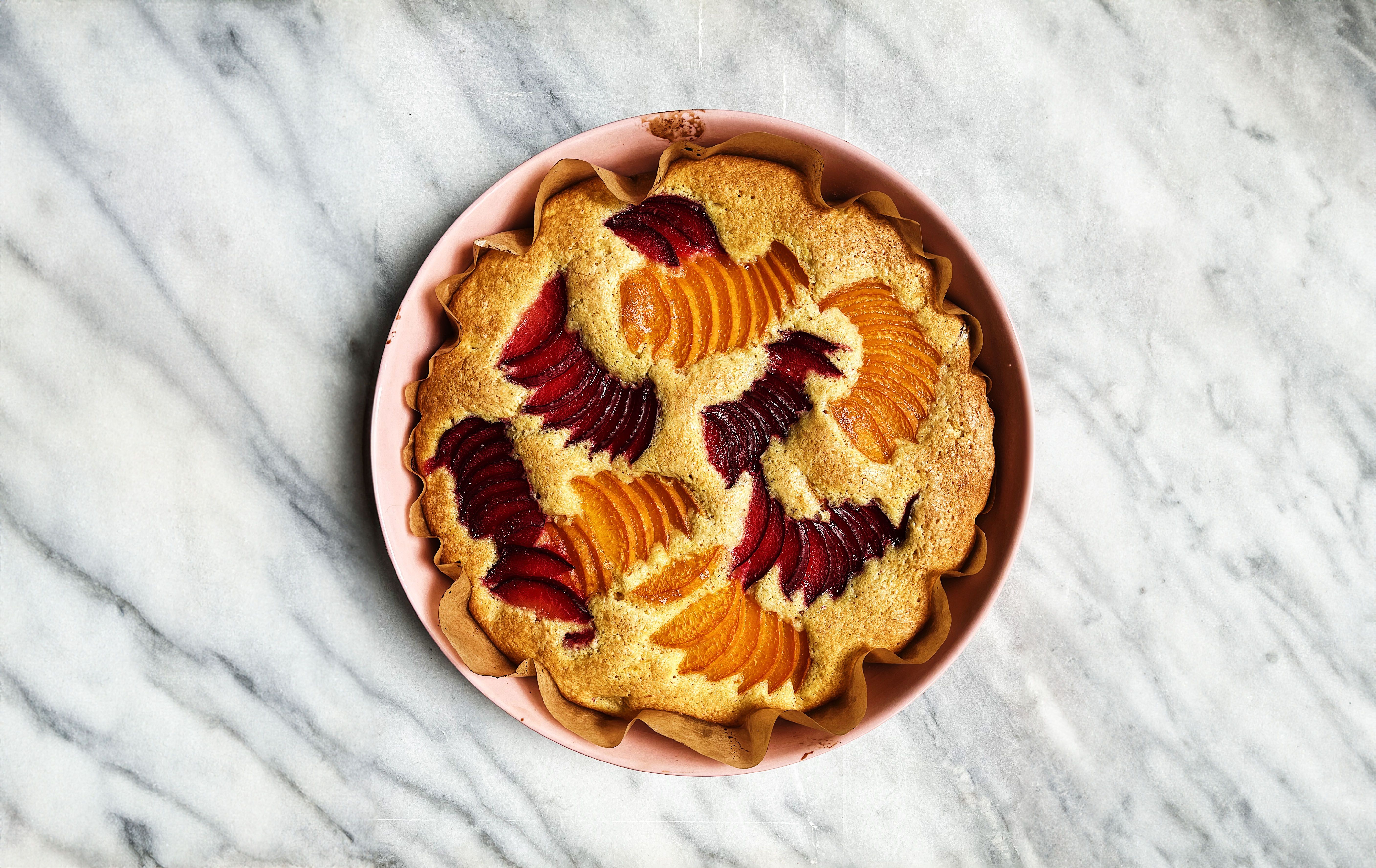 Preheat oven to 350°F (180°C). Butter a Flan Dish and line it with parchment. Cut the cheeks off of all of the fruit and thinly slice. Then cut the remaining fruit off the pits and chop.
