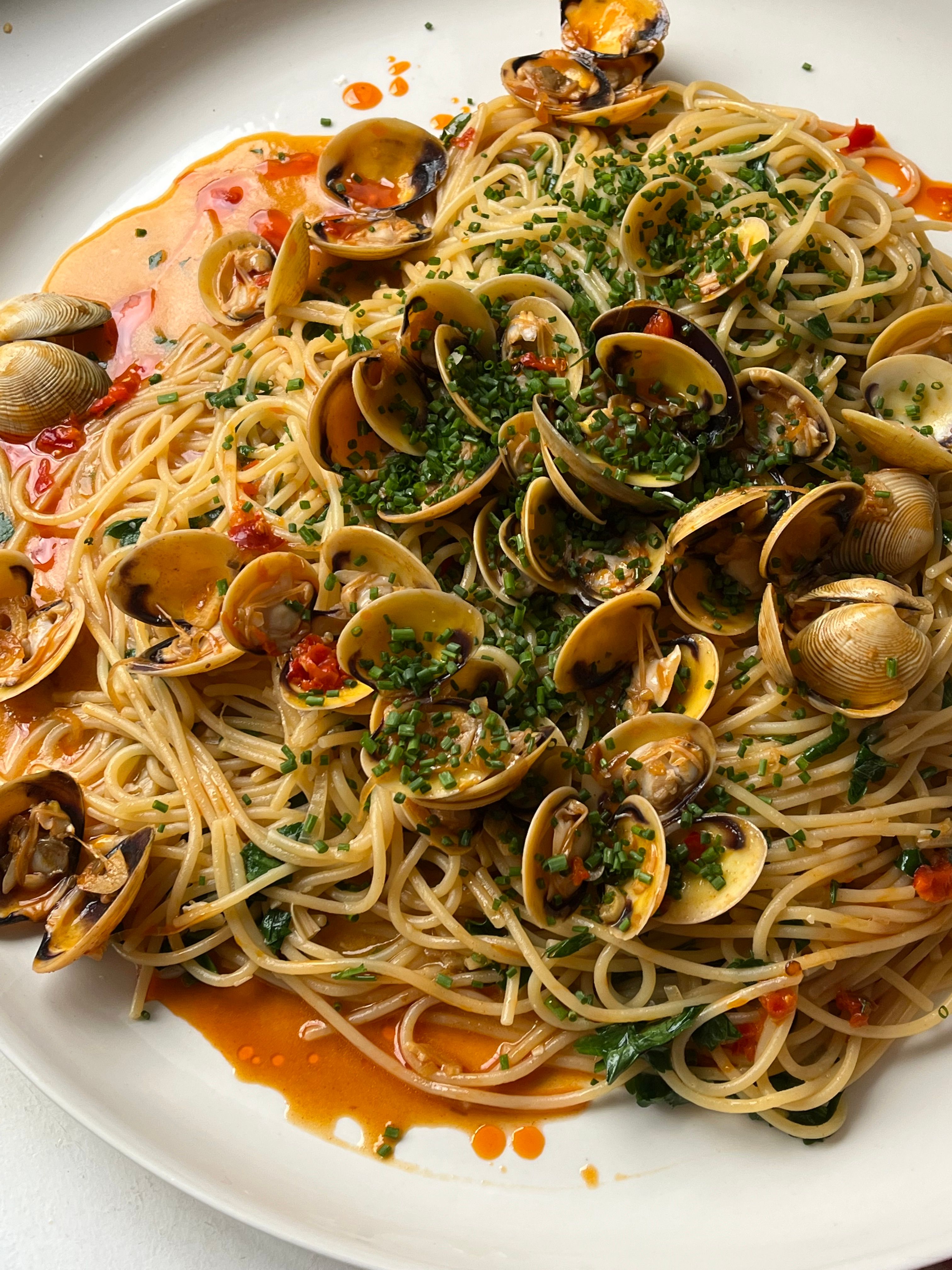 Right at the end, add the vongole back to the pan to coat, add the parsley, check the seasoning and plate up.