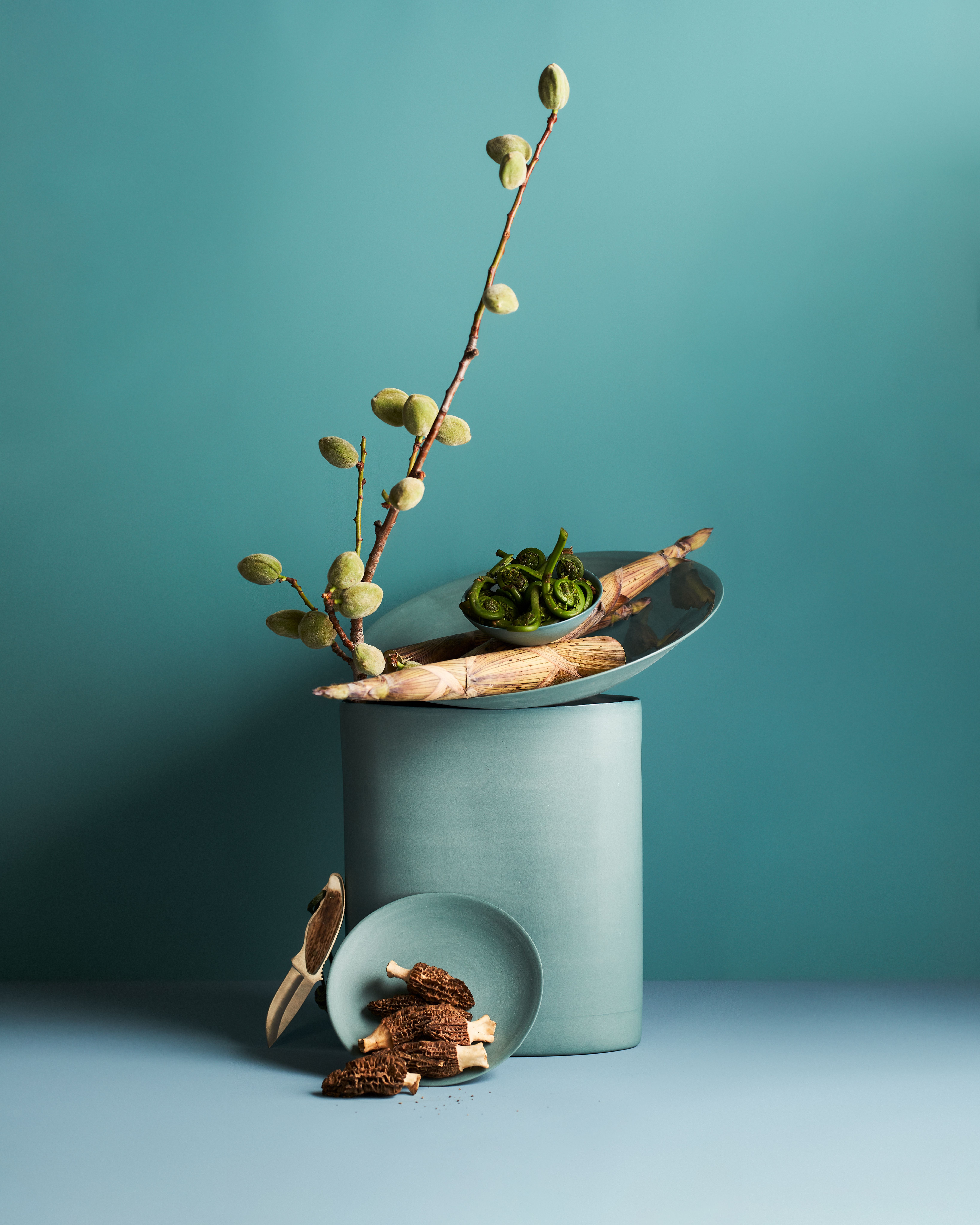 “Linden and I like things a bit imperfect and more real, but still with that surreal element. It’s a little strange to explain. We were originally going to collect trash/treasures on the streets of NYC as more of a quarantine-walk themed shoot, so I think some of that still stuck in our heads for this shoot. A crumbled coke can perfectly fit that (huge kudos to Linden who spent an hour trying to balance it just right). The mushroom and fiddlehead scene is more of an ode to foraging. A spilled pool of cream in an otherwise clean and perfect shot, because life is messy and we like some bit of tension in photos.”