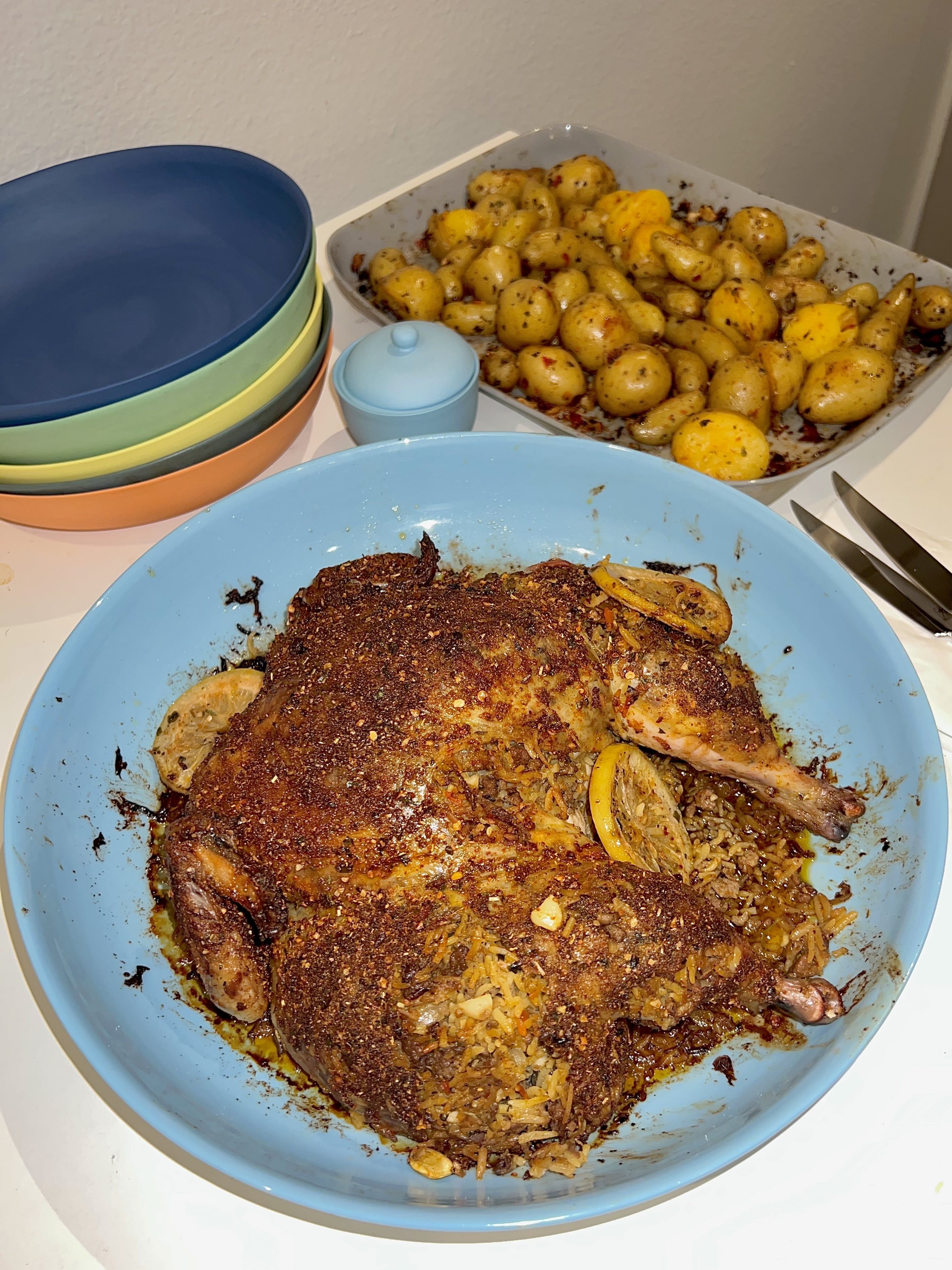 For the stuffing, mix 1 cup of Indian biryani-style rice and 1 cup of either jasmine, white or brown rice. Add the rice between the skin and protein and cook in the oven at a moderate temperature until the skin starts to get crispy. Then add potatoes and put them back in the oven to marinate with the chicken juices.