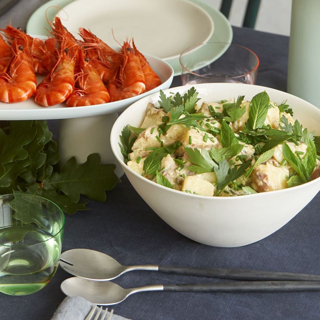 Stir the remaining ingredients into the mayonnaise, keeping back a pinch of each of the herbs for garnish, then, when the potatoes are cool, drain off any remaining vinaigrette and toss them into the mayonnaise.