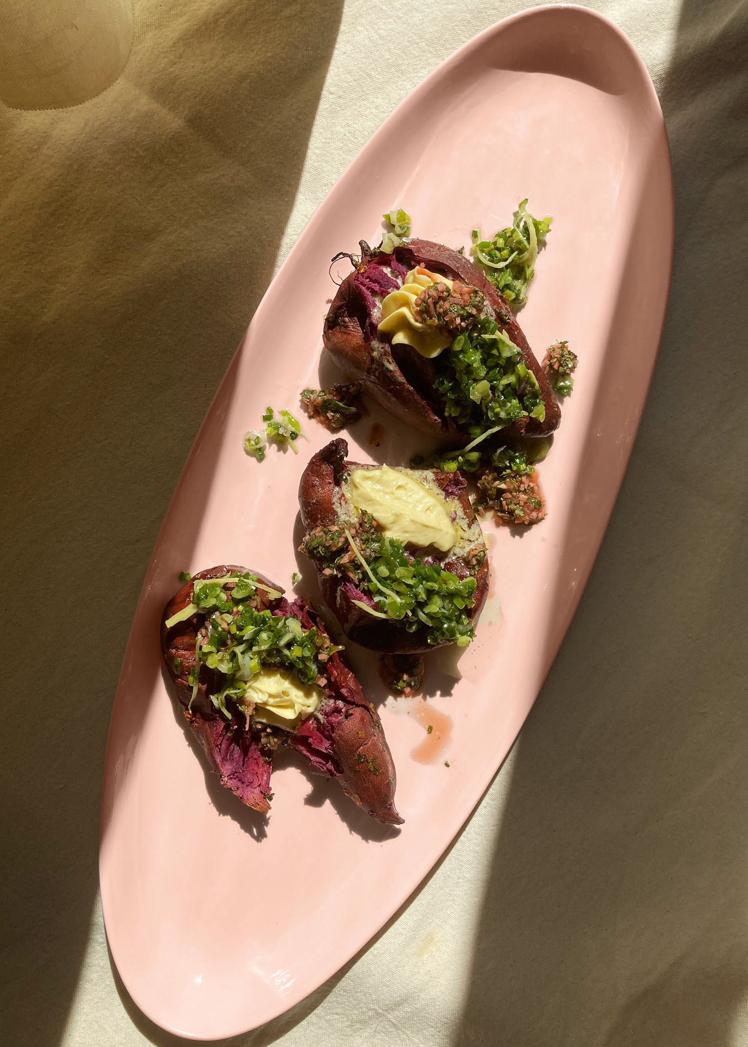 To serve, crack open hot potatoes, add a generous dollop of maple butter, and another generous scoop of the Vietnamese green sauce