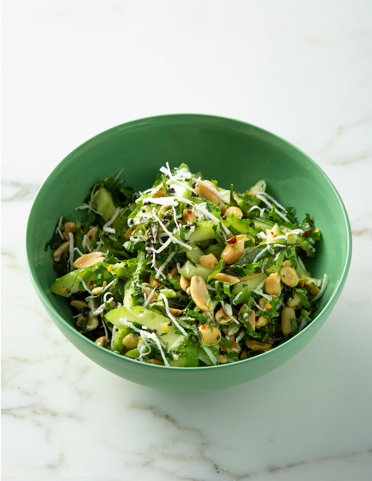 Place the cucumber, green chilli, coconut and herbs in a bowl with the lime juice, chilli flakes and peanut and stir to combine. Heat the oil in a small frying pan over medium heat.