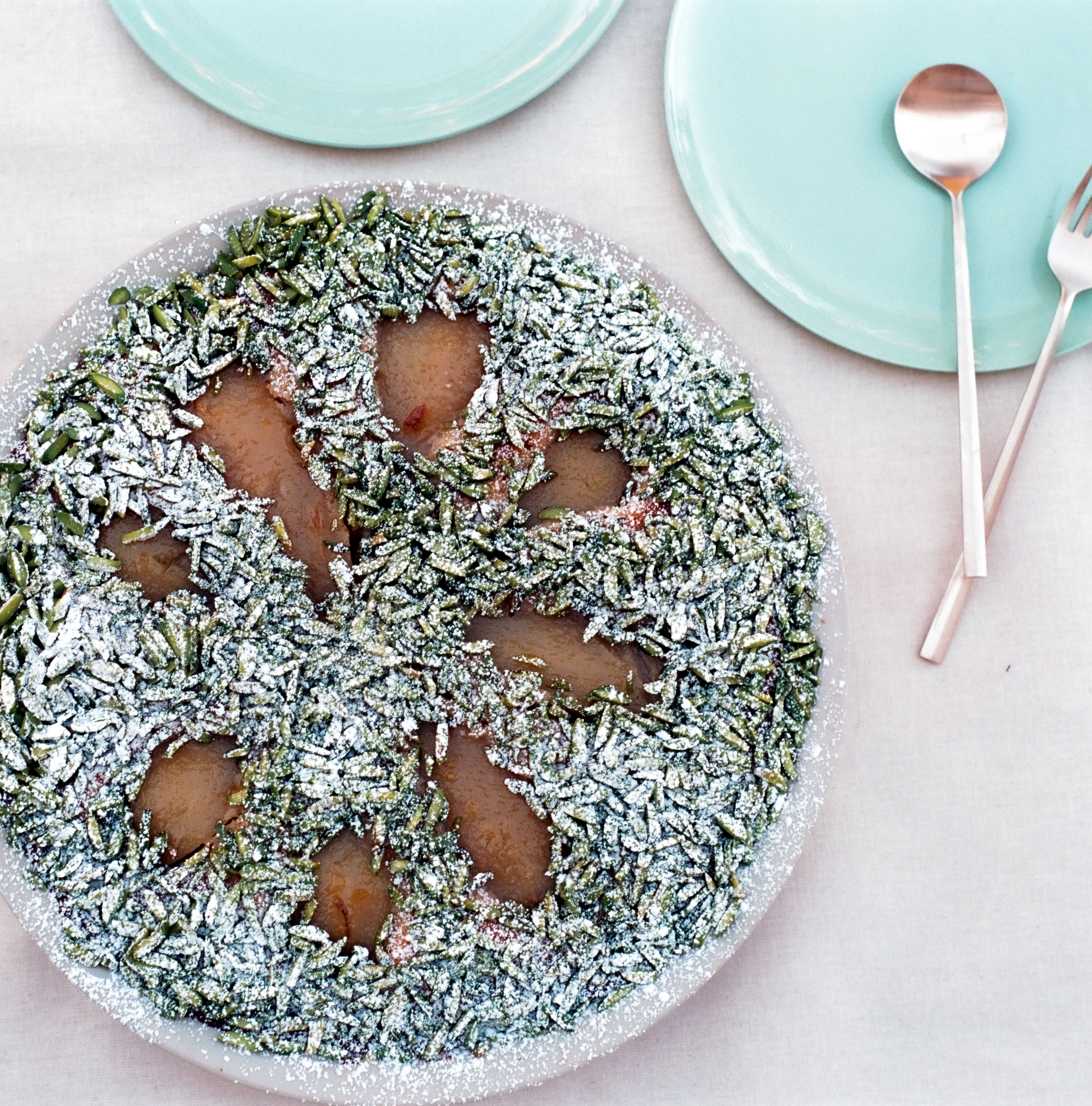 While the galette is still hot, brush it completely with the marmalade. Sprinkle the chopped pistachios over the frangipane leaving the pears exposed. Allow to cool before slicing and serving.