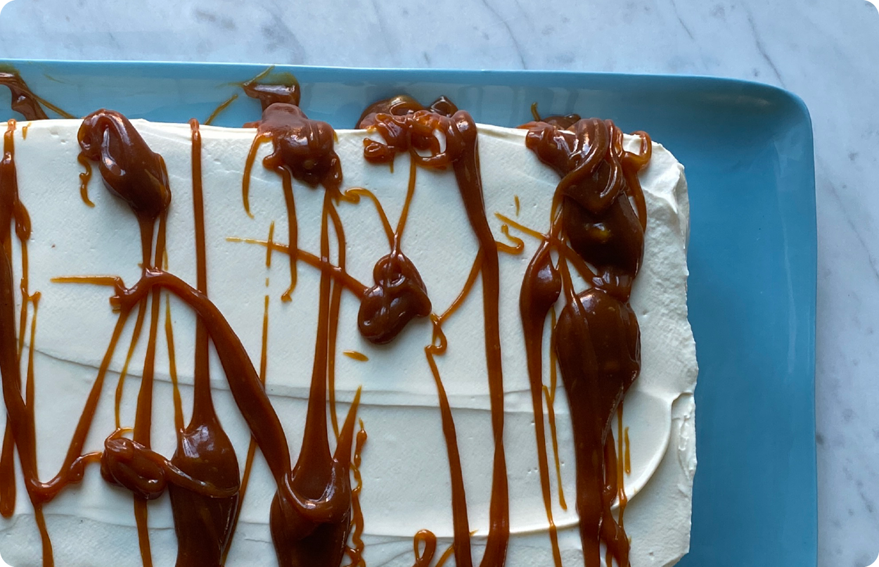 A glamover in the form of a white blanket of cream cheese frosting and a sophisticated French salted butter caramel drizzle transforms the cake. And if you have a sweet tooth there's plenty of extra caramel sauce you can pour over your slice.