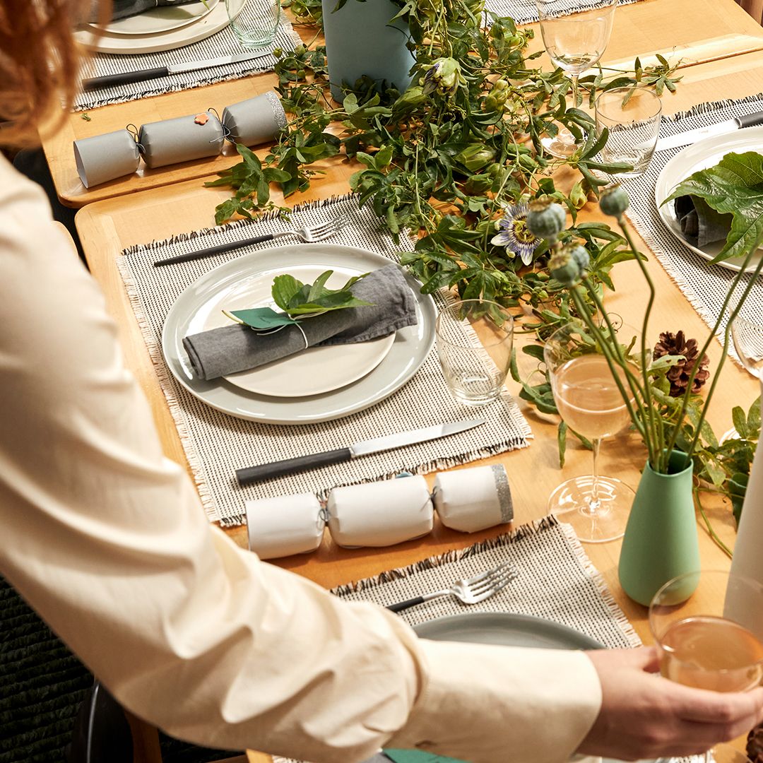 Pictured: Dinner Plate Dust, Bread Plate Milk, Water Jug Milk, Tumbler Small Green and Grey, Linge Particulier Napkin Grey, Mourne Placemat Cloud, Cutipol Goa Dinner Fork and Knife, Sake Jug Wasabi.