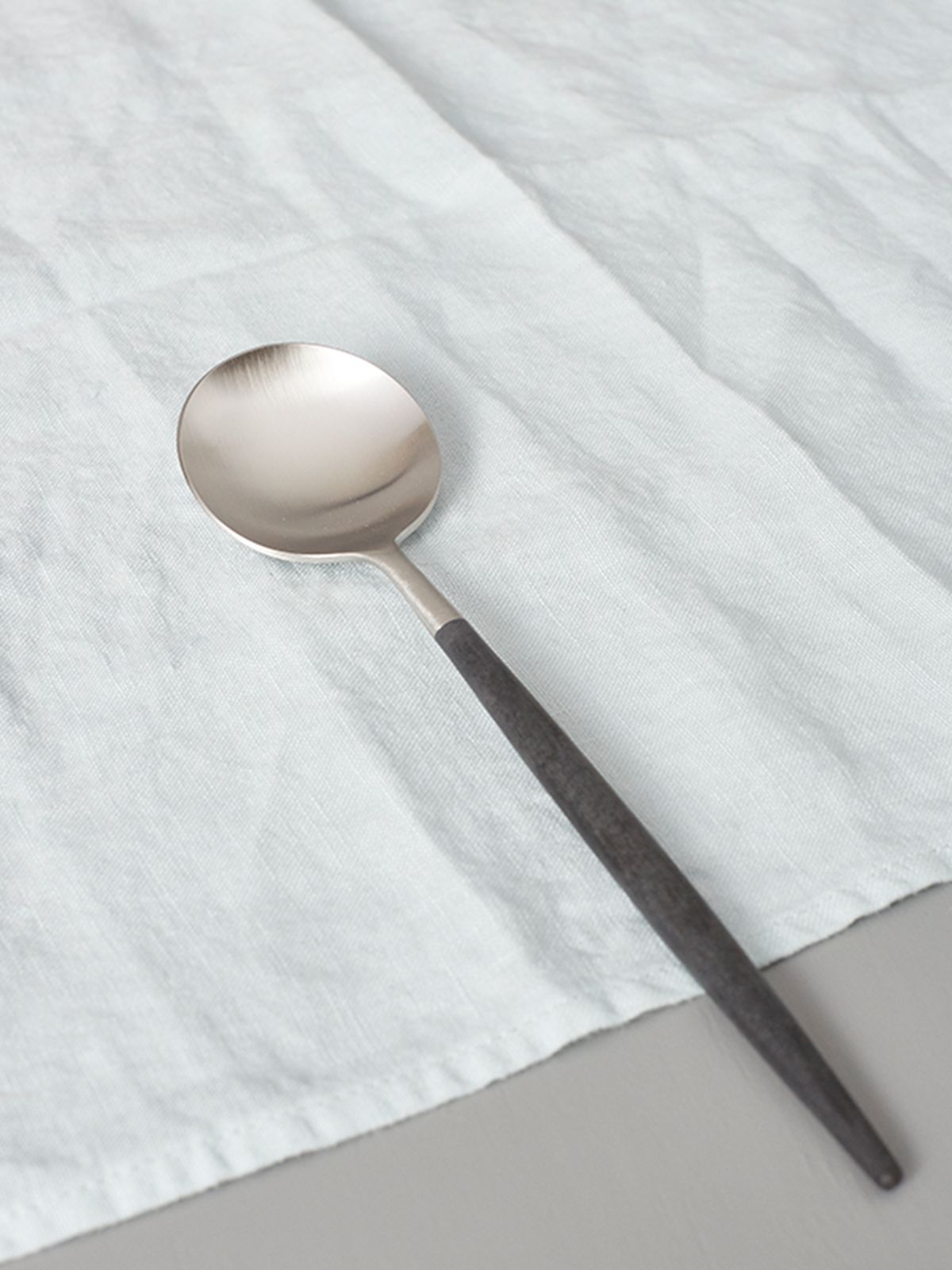 Elegant with minimalist and precise lines. Cutipol is made by a family-owned business in the village of Sao Martinho de Sande in Portugal. The brand perfectly pairs artisanal traditions with modern technology – creating some of the finest modern cutlery. This tablespoon is made with brushed stainless steel and has a refined resin handle.