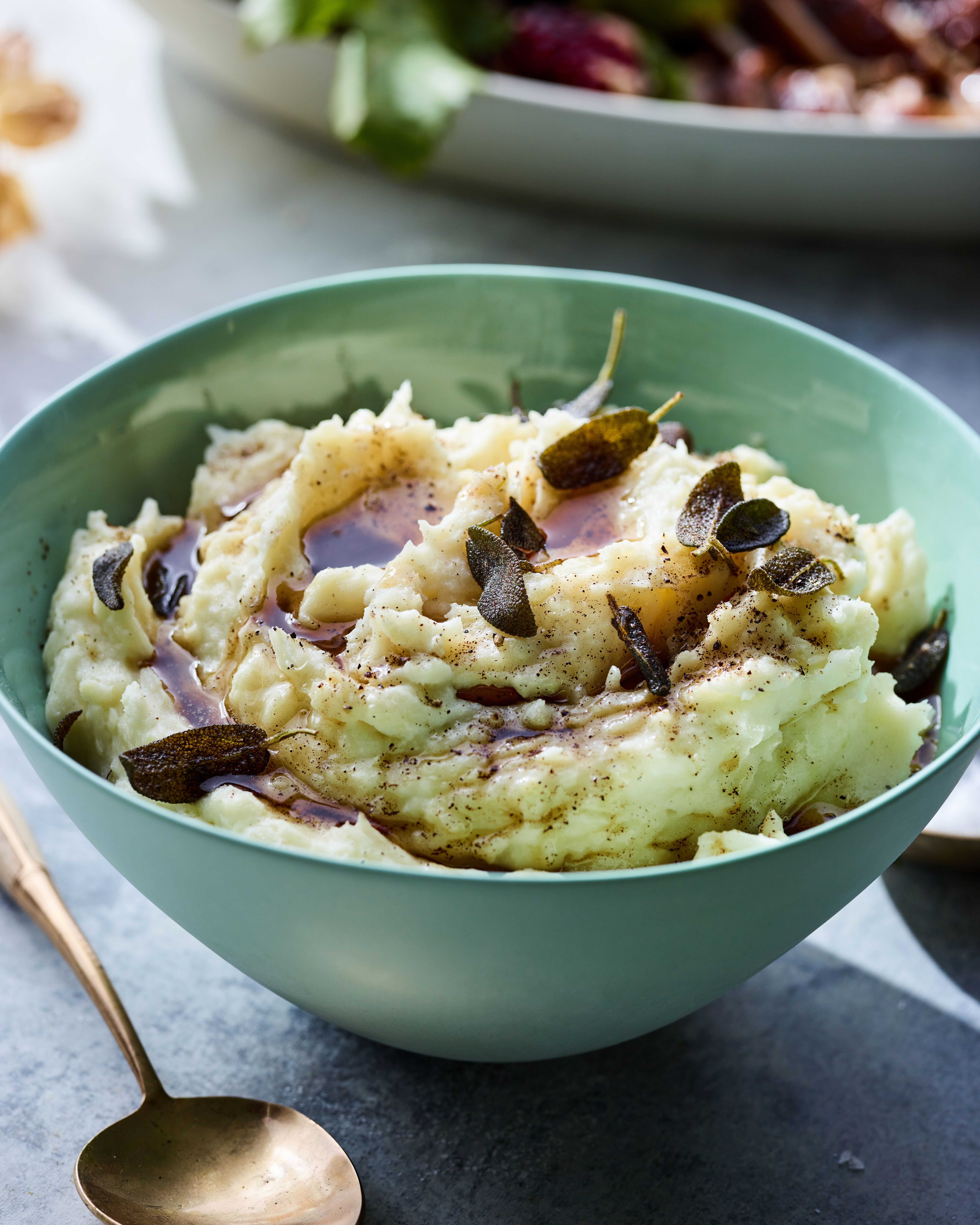 Transfer the mashed potatoes to a serving bowl and drizzle with the browned butter. Garnish with the crispy sage leaves.