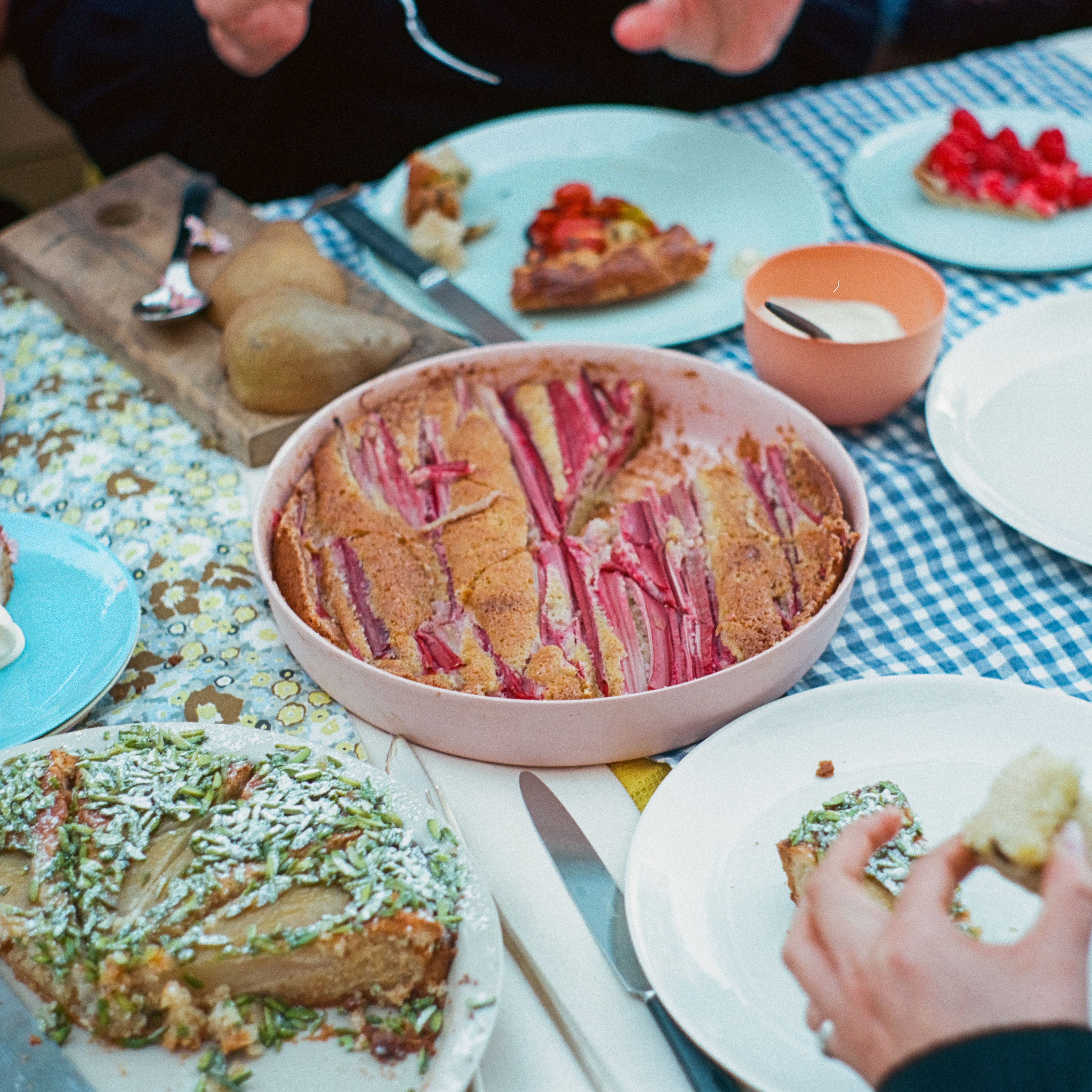 Trim the rhubarb and split the stalks in half or quarters so they are quite thin. Assemble them on top of the cake batter so that you completely cover the batter and stack them on top of each other to create two layers of rhubarb.