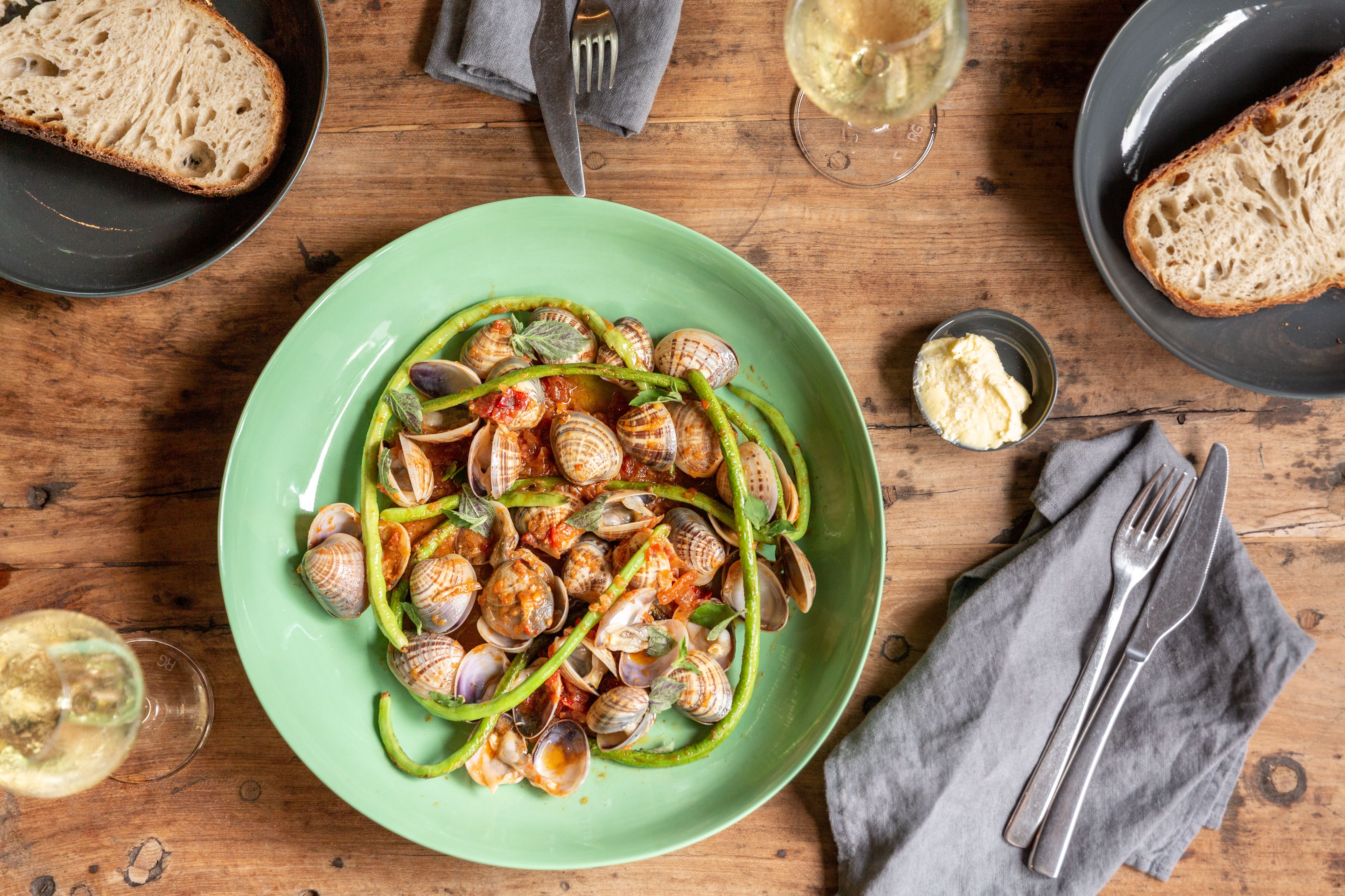 Once opened, add all clams and snake beans to a large bowl, and toss lots of basil through. The more variety in the basil, the better.