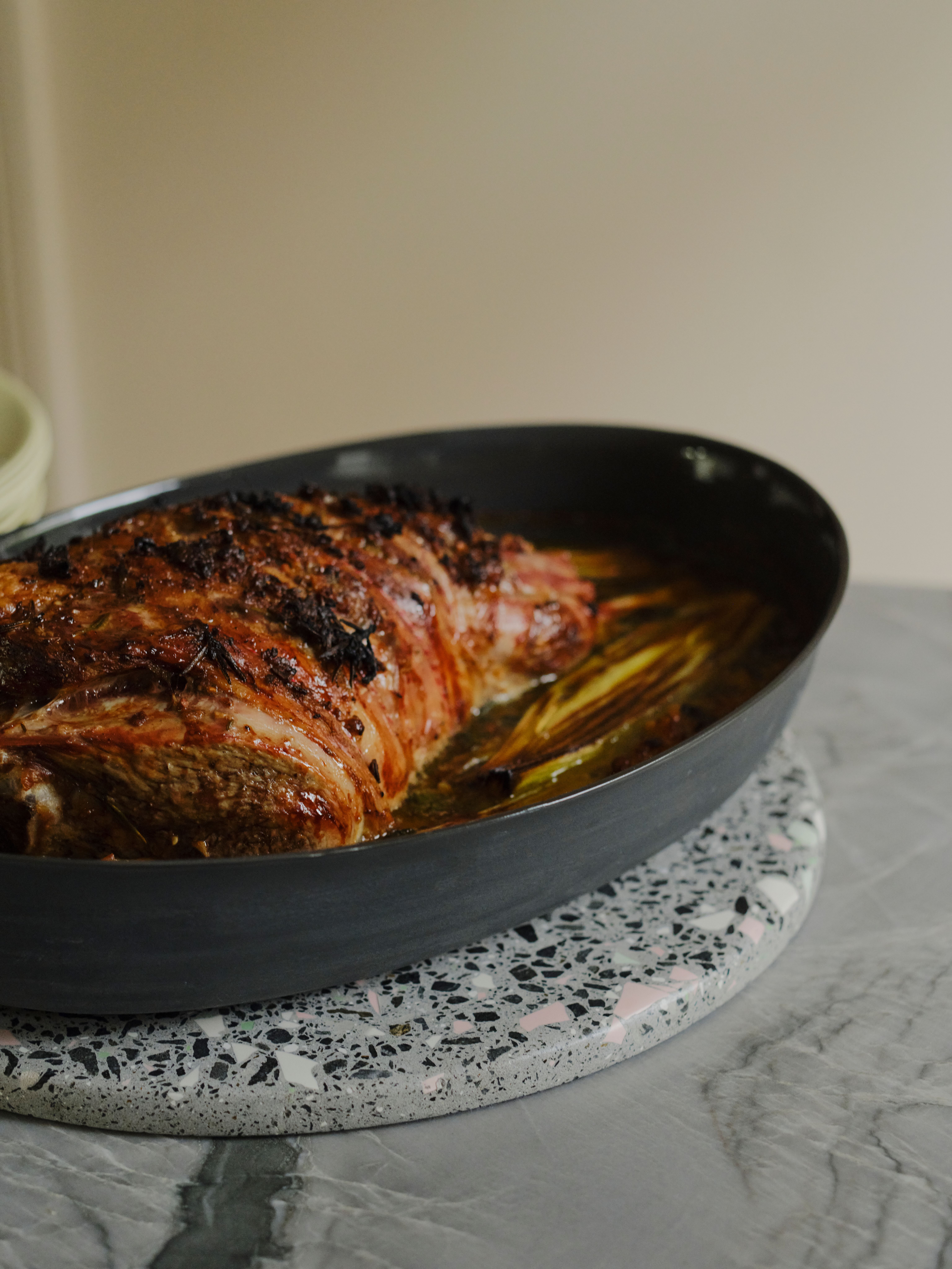 Transfer the bean mixture into the baker that has caught the drippings. Nestle the quartered leeks into the beans, then place the lamb on top. Return the dish to the oven.