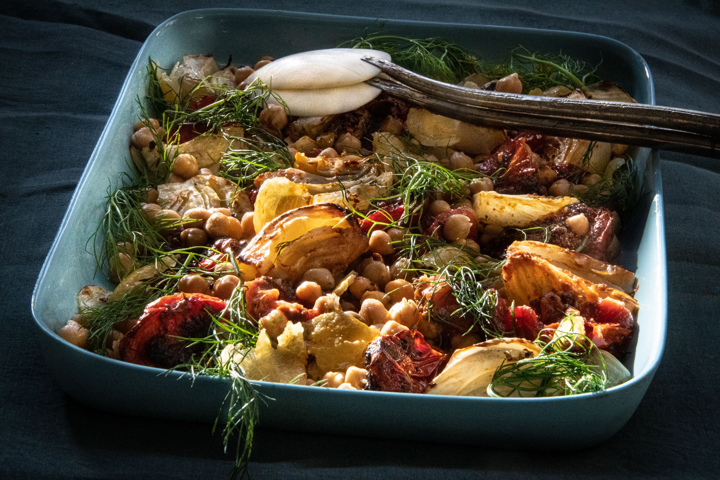Roast the tomatoes for 35-40 minutes or until caramelised in patches. Stir the chickpeas into the fennel and taste for seasoning.