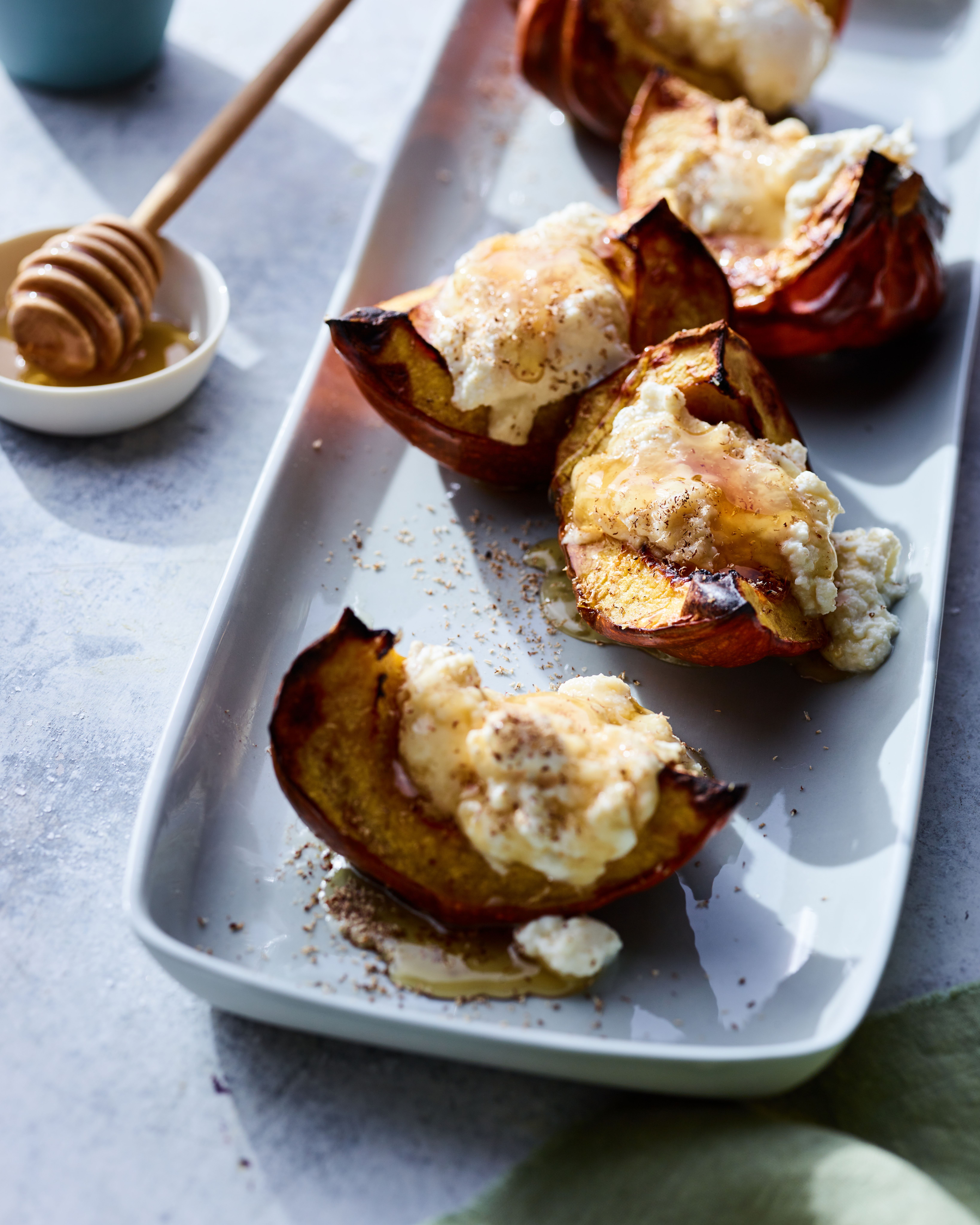 Remove from the oven and let cool slightly, top each piece with a dollop of ricotta, a drizzle of honey, a sprinkle of pomegranate seeds and a hearty dusting of freshly grated nutmeg.