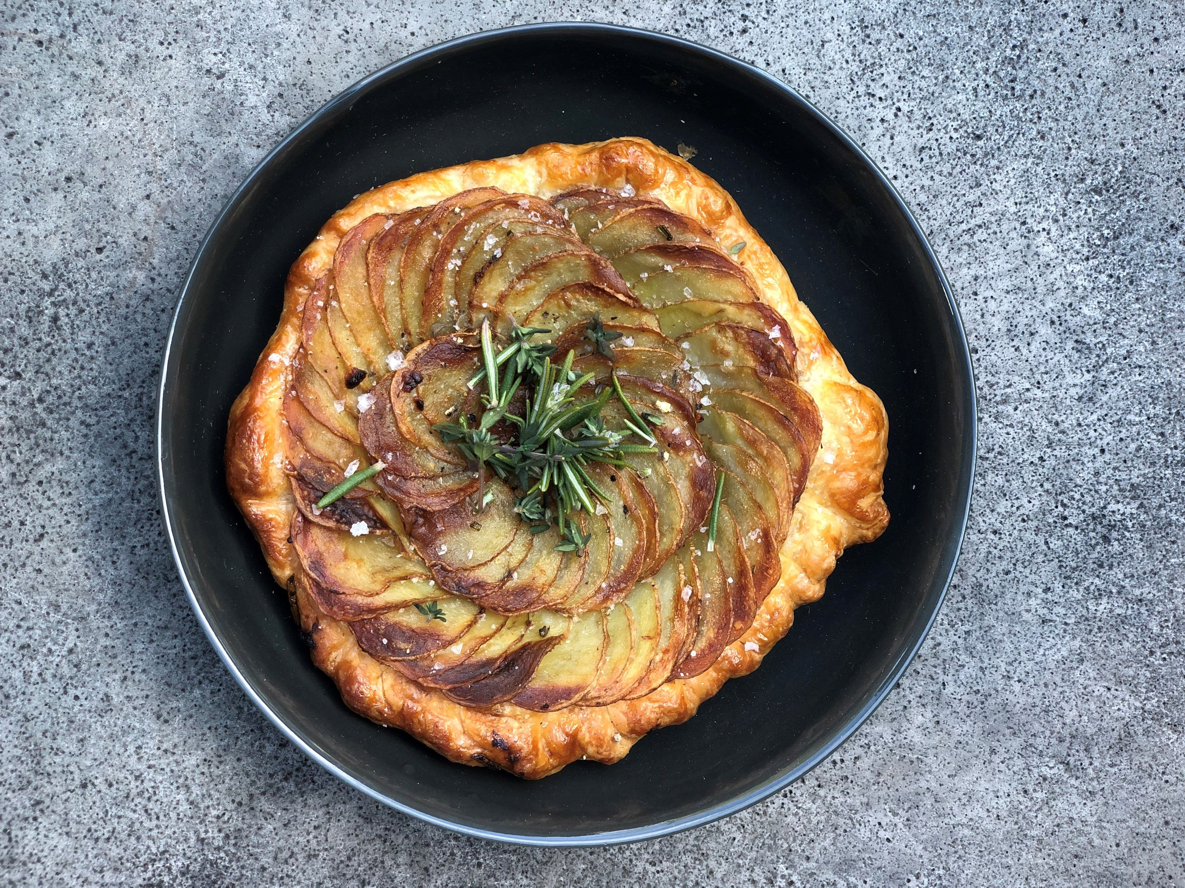 Begin placing sliced potatoes by fanning out around the edges leaving a 1 cm gap from the pastry edge and circling in towards the middle until covered.