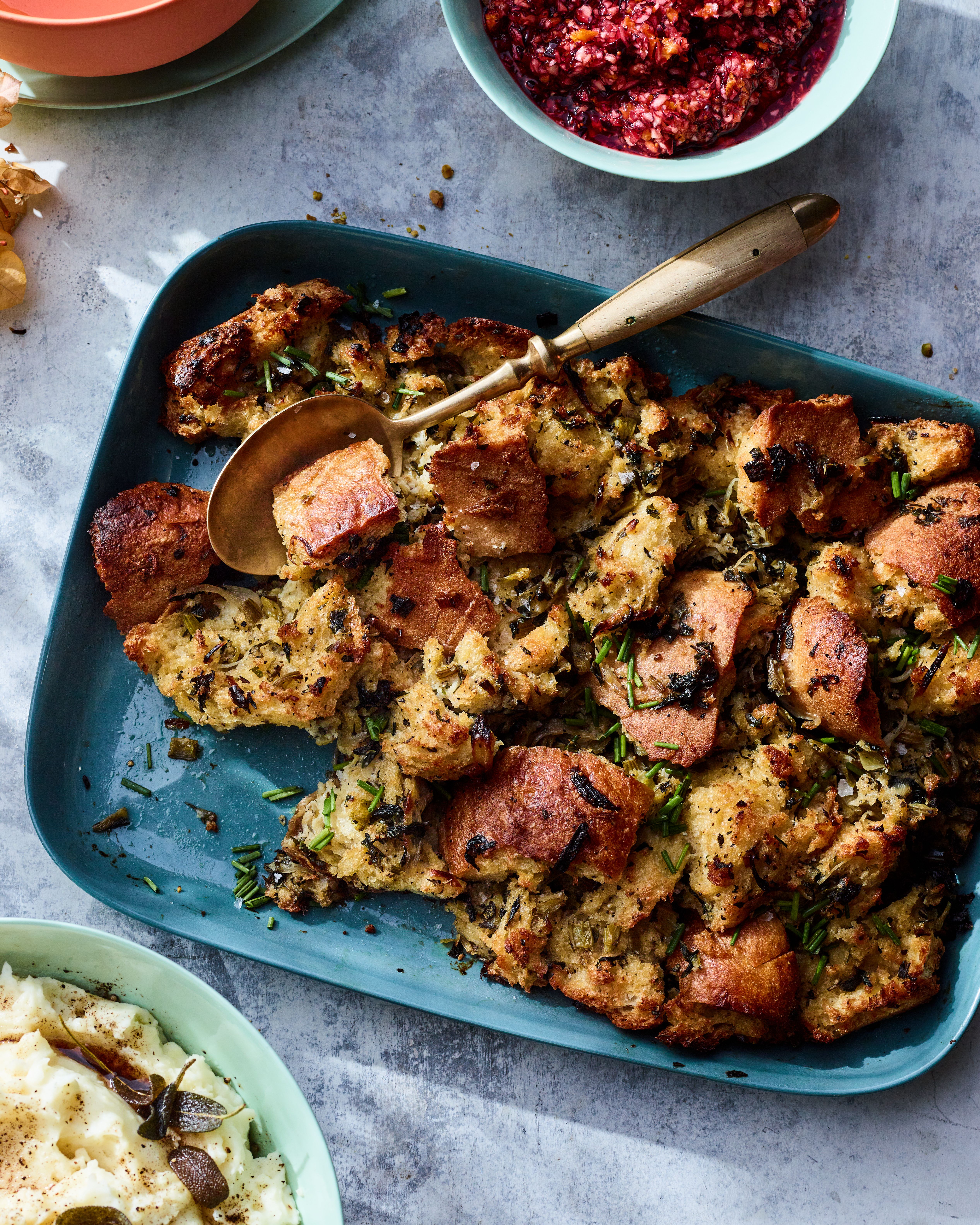 In a separate small bowl, whisk together the eggs and 475ml (2 cups) of the chicken broth. Pour this mixture over the bread and herb mixture in the bowl. Stir to combine; if the mixture feels too dry, you can add additional broth for moisture.